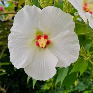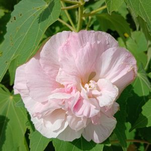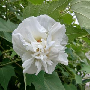 スイフヨウ(酔芙蓉)が咲いていました。 八重の姿が美しい花ですね💕 これは午前中の姿ですが、夕方には赤い花に変身するのでしょうか❤😃