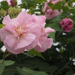 【酔芙蓉】《アオイ科》 花言葉 「心変わり」「繊細な美」「幸せの再来」 「しとやかな恋人」 別名 木芙蓉 花が朝に白く咲き 午後にはピンク色に 夕方には濃い紅色へと 変化する様子が まるで酔って変わっていく姿のようだと例えられていることが由来です。
