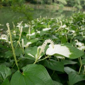 半夏生(ハンゲショウ、カタシログサ) 最初は緑色の葉がだんだんと白くなって半分化粧してるように見える頃 今年の七十二候「半夏生」は7月2日