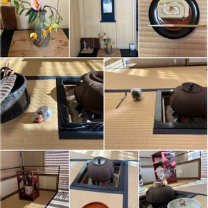 火曜日午後はお茶のお稽古🍵 旅箪笥のお稽古 お花 椿・直姫 釜 茶飯釜 香入れ 貝合わせ お菓子 桜花、干支干菓子 薄茶入れ 蒔絵立ち雛