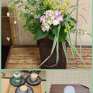 ♡火曜日午後はお茶のお稽古♡ お花 花茗荷、女郎花、ピンク? お菓子 潮騒、花氷 今日は茶箱手前でした❣️