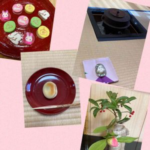 火曜日午後はお茶🍵のお稽古❣️ お花:万両、椿西王母 お菓子:福豆、うさぎの干菓子🐰 香合:金銀小判百福香合