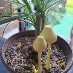 ᰔᩚ ᥫᩣ ハイビスカスアドニスイエロー ①今朝の様子 10ヶ月ぶりの投稿(開花) ②昨日の開花当初 色濃いです💛 ③可愛い蕾やっと咲いてくれました ④⑤コガネキヌカラカサタケ 幸運のキノコ💛🍄💛