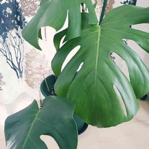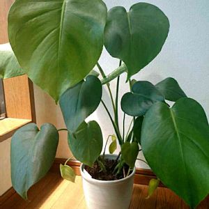 今日の花 モンステラ🌱 一年ちょっとで47センチ位に育って切れ込みのある葉が三枚に割れてない葉が4枚🎵