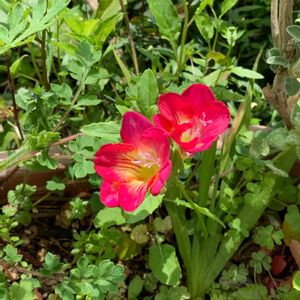 蔓をたくさん伸ばして ちょっと立ち上がって 咲いています この色は好きだなぁ かわいい ♡ 新しい葉っぱも かわいいナ