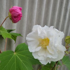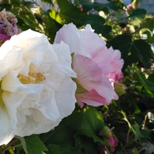 我が家の酔芙蓉さん、朝から酔っ払ってるみたい❣ 白い花が咲いてきたばかりの花で、ビンクの花は昨晩 我が家の殿みたいに、晩酌で顔を赤く染めています❤🩹