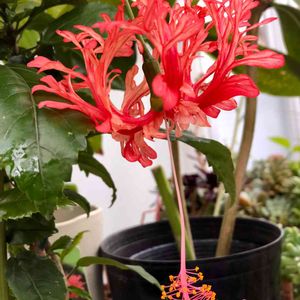 🌺 フウリンブッソウゲ (ハイビスカス) 🌺 🌟花言葉 繊細な美・新しい恋 昨日のつぼみが今朝、雨の中咲いていました🌺