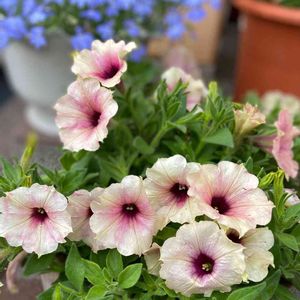 こんばんは😊 やっと涼しくなったので水遣り🚿 玄関先の優しい色のクレイジーチュニア🌸 綺麗に咲いてくれました☺️✨ 後ろのアズーロコンパクトもモリモリに💜