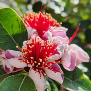 フェイジョア フトモモ科 花壇で咲いていました。 果実はパイナップルとバナナの中間のような芳香があり、生食やジャム、果実酒になるそうですが、食べたことがありません 🏷️木曜日は木に咲く花 参加させてください