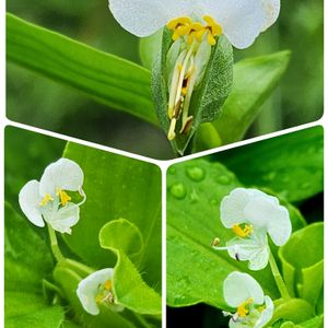 ↑ツユクサ[露草 ↓マルバツユクサ[丸葉露草] どちらもツユクサ科、属 土手下の道に同じ場所で混ざりあって咲いていました