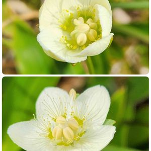 ウメバチソウ[梅鉢草] 別名バイカソウ(梅花草) ニシキギ科ウメバチソウ属 塔の丸にて この花を見たくて行ってきました。何年か前に行った時より数が少ないように感じました。 草丈2~10センチ、花は2センチくらいです。 在来種で、北海道~九州に分布