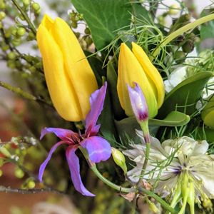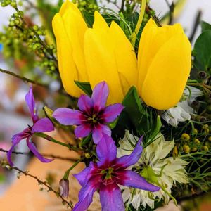 昨日💐生花のアレンジ**... チューリップ🌷3輪💛 リューココリネ3輪💜