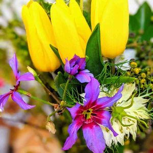 生花のアレンジ💐 チューリップ🌷3輪💛 リューココリネ💜の蕾が1つ膨らんできました(*ˊᗜˋ*)♡
