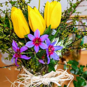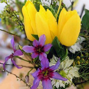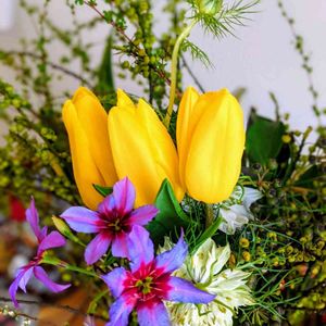 生花のアレンジ💐 今朝のチューリップ🌷3輪💛 リューココリネ💜3輪