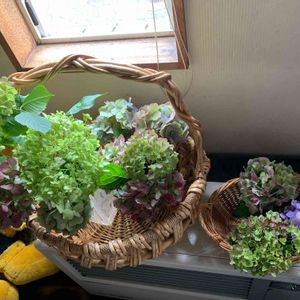 我が家の庭の紫陽花達 すっかり秋色🍂🍁と思ったら一輪だけ中の方に紫色が咲いていました。 紫陽花は長い時期楽しめるので好きです✨ お気に入りの籠🧺に飾ります。 🏷紫陽花アジサイあじさいに参加します