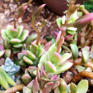 コンバンミ〜🙏🥰😍🤩😉 夜分に失礼致しマス~🙏🙏 水無月(24日)火曜日(☁☂️) 今日は我が家の多肉ちゃんの斑入りを〜📮致しマス~ お高い皆様の様なステキな多肉はございませんが… 私は一般庶民なので~細々と〜多肉を愛して病みませんが〜懐具合と相談して~なるべく〜高額には成らない様には気を付けてマス~(笑)(笑)~ ①…📮する多肉植物だよ〜 全員集合〜 ②…多肉の斑入り寄せ植え ❀雅楽の舞 スベリヒユ科 ポ〜チュラカリア属 流通名 「雅楽の舞」 原産地 アフリカ 別名 「雅楽の舞錦」 「エレファントブッシュ」 原種は「銀杏木」と呼ばれる (ギンナンボク) ❀覆輪万年草 (姫笹) ベンケイソウ科 セダム属 原産地 不明 冬に休眠する 別名 「セダム姫笹」 「リネアレバリエガ〜タ」 「リネアバリエガ〜タ」 オノマンネングサの斑入り種 ❀南十字星 ベンケイソウ科 クラッスラ属 別名「パ〜フォレ〜タバリ エガタ」 星の王子の斑入りタイプ 原産地 アフリカ 花期 春 成長点から伸びて花が咲く ❀サルメント〜サ ベンケイソウ科 クラッスラ属 流通名「サルメント〜サ」 原産地 アフリカ 花期 春 (成長点から伸び花が咲く) ちっちゃいけど〜わかりませんかネ~何故だか~大きく成りましぇ~ん'😫😵😰 ③…セダム (コ〜カサス キリンソウトリカラ〜) ベンケイソウ科 セダム属 原産地 コ~カサス地方 耐寒性多年草 多肉植物 トリカラ〜 やや立性タイプのセダム 斑入りの葉色は寒さに当たると美しく赤みが増していく 暑さ寒さに強く横に広がる ④…覆輪万年草 ベンケイソウ科 セダム属 ❀覆輪万年草 (フクリンマンネングサ) (フクリンマンネンソウ) ➕️ ❀丸葉覆輪万年草 (マルバフクリンマンネング サ) (マルバフクリンマンネンソ ウ) ➕️ ❀南十字星 (星の王子の斑 入り) ⑤〜桜吹雪(サクラフブキ) スベリヒユ科 アナカンプセロス属 耐寒性多年草 園芸品種 花期 5〜7月 桜吹雪は吹雪の松の斑入り品種で斑の入りがピンク色に染まることから桜吹雪の園芸名がついたといわれている 冬 休眠期 桜吹雪のお花💐が咲いてしまった〜アチャ〜花柄らしき残骸が〜垂れ下がってた〜まだ蕾有るけど~⁇⁇ 昨年は咲いてたけど~さほど〜咲いた〜って言う様なお花💐で無かったから〜💐📱パシャリしなかったけど~⁇⁇ お花💐中々見れ無いって言うのはこう言う事かな~⁇⁇ 月下美人の様に夜に咲くって事無いデスよネ~⁇⁇ 蕾が長いまま〜枯れる事も有る🦆デスよネ~⁇⁇ 今日も〜宜しゅうに〜🙏 オヤスミ💤💤💤なさいネ~👍✌️👌👋👋👋