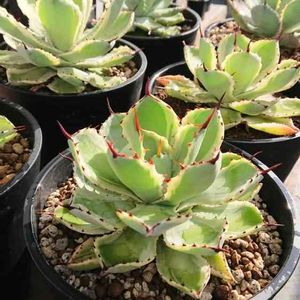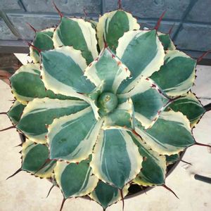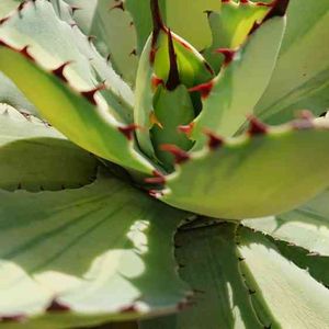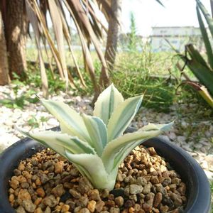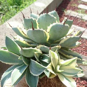 アガベ、吉祥冠錦。まだ小さいけど、斑入りのさわやかな色合いと、赤黒い鋭い棘のコントラストがいい感じ。
