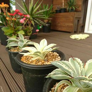 アガベも大好きで集めてます ほんの一部ですが軒下に避難😆 チタノタNo.1をやっと手に入れられた😉 ちいちゃいくせに高かった😱 アガベって高いよね💦💦 華厳も写真に入れたかったけど見当たらず どこ置いちゃったけな笑 と思ってたら2階のベランダに置いたんだったー また今度~