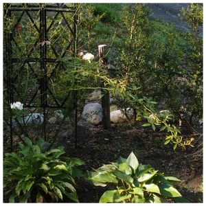 アヤメ越しのバラ スノーグース🌹 以前はイボタケを支柱にしていましたが存在感が半端なく… コメリの普通のトレリスに変えて、スッキリ! 追記…壺型クレマチスが欲しいなー🍑できれば桃割 追記…壺型クレマチス、買っちゃった🥰ピッチェリと這沢と何とかスカーレット