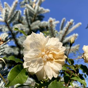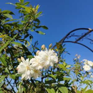 公園の白い薔薇 青空に映える スノーグース 白い鳥の羽毛のことかな