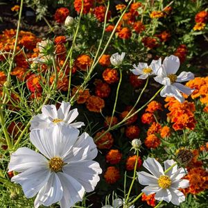 こんばんは。 朝、投稿したマリーゴールドの花畑。 横には、コスモス畑もありました。 コスモスのほうは、ちょっとまばらで。 別のエリアには コスモスとマリーゴールドが 混じって咲いていました。 白いコスモス、好きです。 今度は他のところを見に行こう。 毎年、行われていたコスモス祭り。 今年はコロナで中止に。 でも、例年通りに花は咲いているそうなので 行ってみようと思います。