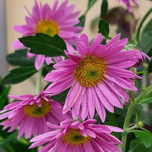 こんにちは👋😃 庭で、違う色の菊が、 咲き始めました。 優しい淡いピンクマム です。 クジャクアスターも、あちこちで、咲いてます。 切り花でも、可愛いですね。