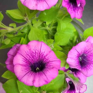 ペチュニア、紫小紋 2年目親株です。 かご鉢5号、相変わらず控えめな花が、可愛く咲いています。 挿し芽したこも、5号鉢に、元気に咲いてきました。