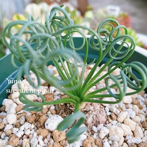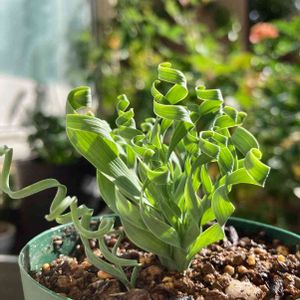 アルブカ スピラリス フリズルシズル 夏の間は休眠していてようやく葉が出てきました。 今年は目覚めが遅かったみたい。 くるくる度がイマイチなのは、カーテン越しで日光不足だからだと思う。 来年花が咲いたら種を採って、、、とまた増産計画しています。笑