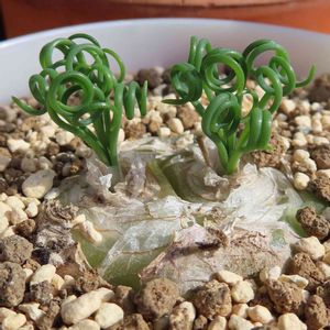 アルブカ スピラリス フリズルシズル ܾ ܾ 𖥧𓇣𖦥𖥧𖥣 名前覚えられた (*´︶`*)b この子は実生チャレンジの目標 ・ モチベにする為に お迎えしたオトナフリズルシズルさん 最初の数日だけ室内で 以降は完全にベランダ置き 今日はこの写真よりもっとクルクルに 〜 実生チャレンジ報告 〜 (長いので興味有る方だけ) 09.07より約2週間毎 計3回蒔く 一度に2~4ポッド使用 計約10粒前後 様子を見つつ微妙に条件を変えて結果を見るも 発芽率等余り変わらず 発芽日数 5日〜10日 10日経っても出ない場合は それ以降待っても一切出なかった 09.20に上げた写真の子は育たなかった 前もって幾つかのレポを読んでいて そこに上げてある写真と違和感を感じていた それは色、、どうして白いんだろう、、? うちの場合 基本 発芽率 約1/3 その内 白いまま 2/3 ー 全て枯れた ちゃんと緑 1/3 ー 健やかに成長 発芽した時は両者とも元気だけれど 白い子は葉緑体が無いと思われ 種からの養分が切れるであろう1週間を目安に全滅 同じポッドに複数蒔いて ポッド内は同じ条件で発芽して 白い子だけ枯れてく…… メンタルキツかった…… 先っちょにぶら下がったままの種は恐らく重要 暫くは見える芽の部分はあまり様子が変わらないけれど その間土の中で根を真下に伸ばしながら 土の表面に隠れる位置で球根を膨らましている 1ヶ月で2、3mmのサイズ 根を真下に伸ばすのに伴って全体が浮き上がらないよう 先っちょの種は重しの役割をしていると思われた 雨は当たらないので取れる気配なし 発芽から約2ヶ月経った今も付いている 最初に濡れたティッシュで水に浸けたり 種の外皮に傷を入れたり 被せる土の厚さを変えたり 室内発芽 ・ 屋外発芽、、等 条件を変えてみたのは発芽率に影響は無く 結局、白い子(葉緑体無し)が出てしまうし 種自体の質の問題だなぁ。。と (種を入手してから蒔くまでの保管は レポを書いてる方々が取っていた形) 結果を見ながら条件を変えて、なので 3回繰り返しただけで軽く1ヶ月半は掛かり 実生チャレンジに取られる分の意識が結構大きく 、、、大変 今は緑で発芽した3株とも1つの鉢に植え替えて 安定している(写真はそのうち) が、、このオトナなフリズルシズルになるまで何年???が率直な感想 (⸝⸝⸝ᵒ̴̶̷̥́ - ᵒ̴̶̷̣̥̀⸝⸝⸝) 夏に休眠するという特徴 秋9月に目覚めて伸び始めるらしく 9月生まれの私にはなんだか嬉しく楽しみ ちなみに『アルブカ』の語源的意味は『白い』らしい 見つけた人が白い花を見て バニラのような甘い良い匂いの花もまた楽しみ (´ ˘ `๑) おチビちゃんたちがそこに辿り着くまでは オトナなフリズルシズルさんよろしく、である ܾ ܾ 𖥧𓇣𖦥𖥧𖥣