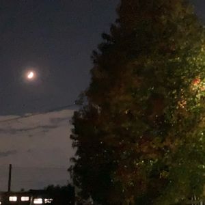 学校のライトで紅葉が浮き立ちます。 月が実際はときんときん、 東海地方の方は分かるかな😅 写真だとぼけてますね〜💦 寒い夜です。