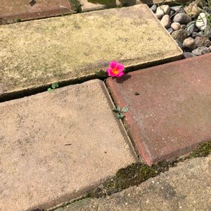 庭に敷いてあるレンガの隙間から顔を出した パッと目を惹くお花🌸 ポーチュラカ…でしょうか⁇かわいい💕 もっと増えてくれてもいいよ〜😁