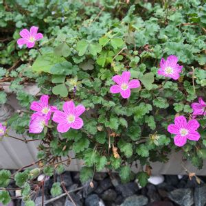 ヒメフウロソウ💕&パンダスミレ🤍💜✨ 昨年 古株さんから分けた ヒメフウロソウ、相変わらずポツポツですが、お花がきれることなく咲いています(*^^*) パンダスミレさんも 真ん中から にょーっと出てきました(*´艸`*)♡ この子も強い子ですね💜 親株さんは 鉢から溢れて ブロックの隙間からも出てきています(*´艸`)