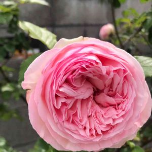 粉粧楼が咲きました。 淡いピンクです。 このバラは気まぐれで蕾が開かないまま枯れたり、濃いピンクだったりいろんな咲き方をする不思議なバラです。