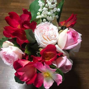 ミニバラ バレリーナ。 一重のバラが房咲きになっています。 一目惚れして我が家に来てもう10年くらい、ずっと咲いてくれています💕