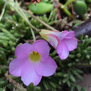 本当はもっと淡いピンクなんですが薄紫色に映りました。 オキザリス なんだったかな❓ 多肉丼に紛れた球根が咲きました。