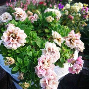 こんにちは😄 10月に買ったペチュニアが たくさん咲いてきました😆💕 品種は「ホイップマカロン/モカモンブラン🌼*・」 アンティークな色合いですが寒くなり ピンクが濃くなってきました😍 旦那が上からジャージャー水をかけるので 真ん中がヘタレてます🙈💦 こんもりなるように ちゃんと見守らなきゃ❗