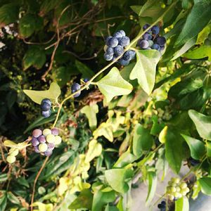お墓まいり その4 帰り道、母の同級生のお宅の前のコンクリートの崖に多種の草やツルに青い実がなっていました。 何の実なのでしょう? アオツヅラフジと教えて頂きました。