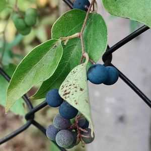♡アオツヅラフジ(青葛藤)♡朝散歩🚶♂️56日め フェンスに葡萄のような実を発見! ●ツヅラフジ科 アオツヅラフジ属 別名 カミ緑色の細いつるは、枝分かれしながら左から右巻き方向に他の物に巻きついて長さ2m以上にも伸び若いつるは細かい毛が密生するのが特徴である。つるはオオツヅラフジほど太くはならない。葉は互生し、形は全縁で、卵型あるいは広い卵型ないし心臓型をしており多くは葉先が丸く浅く3裂することもあり形にはバラエティがある。長さは6cm前後でオオツヅラフジと比較して大きくならず葉柄も短い。表面は少し光沢があり短毛が密生。葉脈は基部からの主脈が目立つ。 7 - 8月にかけて円錐花序が枝先と葉腋から出て、淡黄色ないし黄白色の小さな目立たない花を多数つける。 果実は核果で、秋に6 - 8(mm) の球状の果実が房状に結実し晩秋のころブドウのように緑色から青く熟して目立つようになるが有毒である。熟すると表面はやや粉白を帯び、つぶすと紫黒色の汁が出る。果実の中に直径4 mmほどの核(種子)が1個入り、形は扁平で円くカタツムリの殻を思わせる(英語名の由来)。 アオツヅラフジの名はアオ(青)は生きているつるが緑色であることから、「ツヅラ」は葛籠などのかごを作るために用いられたことに由来する。地方によりチンチンカヅラ、ピンピンカヅラともよばれ『万葉集』には黒葛の名で登場する。