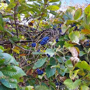 実家のマサキの木に絡みついたアオツヅラフジが、たくさん実をつけて青く色づいてきました。