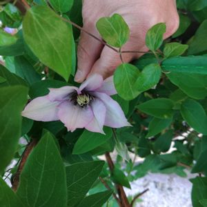 クレマチスが咲いてきました ➀サマリタン・ジョー 白に紫のエッジが入る上品なお花 あまり伸びないので育てやすい ➁あわい GSで沢山のお花を丁寧に素敵に育てていらっしゃる方のお写真を拝見し、可愛らしい姿にお迎えしました 白にピンクとグリーンがまざり一部葉のような姿になる (及川フラグリーンHPより) ➂桃花 ➃ティータイム・オブ・モナリザ その後…未熟なのかタグのようなお花にはなりません😅 ➄華川 糸状の花芯が華やかで白とグリーンのグラデーションが素敵です