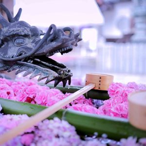紫陽花の花手水🌸 龍の口から滴るしずくがヨダレのよう…笑 ピンクの紫陽花が綺麗で癒されます…✨✨ それではおやすみなさい~🌸🌸