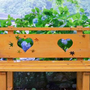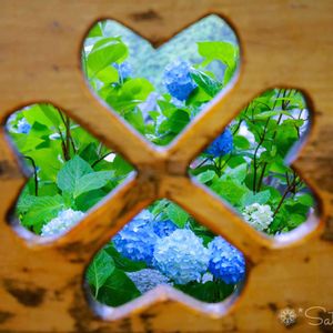 6/28にupしていたハート型窓から見る紫陽花の全景…(*ฅ́˘ฅ̀*)♡ 前はハートを拡大した写真だったけど、こんなハート型ベンチなのです🌸✨ クローバー型の窓になってるベンチもありますஐ♡🍀~ஐ 可愛いですよね💜