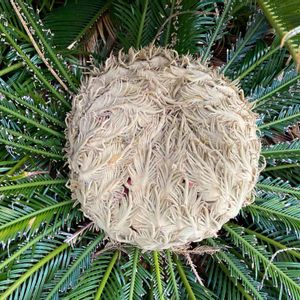 ソテツ(蘇鉄) ソテツ科ソテツ属の常緑低木 雌雄異株 裸子植物 別名:鉄蕉▪鳳尾蕉(ほうびしょう)恐竜時代のジュラ紀から生息していた「生きた化石」と呼ばれることもあるそうです。 ソテツの雌花 花は、10年に1回、6~8月にかけて、開花するそうです。(実が熟すのは、11月~2月) ドーム状の羽のような塊の中には、種子が入っていたようですが、見当たらず、赤い果皮が少し残った薄茶色の種子が木の下にポツポツ落ちていました。