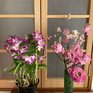 また庭は雪景色☃️☃️ 少し日差しが届いて⛅️ます 外で寄せ植えをしよう〜思ってた花かんざしとラナンキュラス🌸 もう少し部屋に♪大きな鉢に植え替えた🌸🌼 デンドロビウムはまだ元気いっぱい💕 花見山公園で買ってきた梅の花は蕾だった🌸 ちょっと花が開いている♪♪♡ それぞれ違う環境で育ったこの子たち🌸🌼 仲良く私とお留守番〜よ