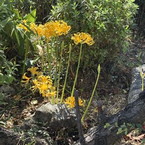 ショウキズイセン 日向薬師の境内で鮮やかな黄色い 彼岸花を見つけました。 中心から突き出している長い蕊も 黄色💛でした🍀