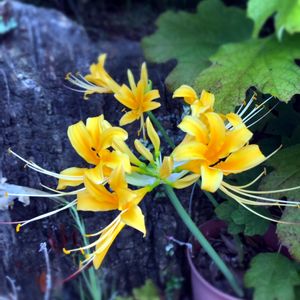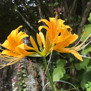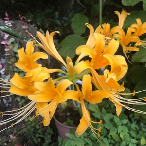 🧡鐘馗水仙🧡 珍しい花👀📷️✨に会いました😲 和名で鐘馗水仙(ショウキズイセン) 別名鐘馗蘭(しょうきらん) ヒガンバナ科リコリス(ヒガンバナ)属 ギリシャ神話に登場する海の神リコリスに由来する。英名は「ゴールデン・スパイダー・リリー。 調べてみたら、赤や白花の彼岸花の最盛期よりも少し遅めに咲き始める「ショウキズイセン」~と記載がありました。 まだ今年彼岸花を見ていないのに😱 実は 白花彼岸花は紅い 彼岸花 と ショウキズイセン を交配してできた そうです🤔 花茎は50~70cm、花の径は6~10cmほどで、茎の先に4~10個が輪生する。花弁は6枚で、縁が波打ってしわになり少し反り返る。和名はその様を厄病の悪神を追い払ってくれるという鍾馗様の長いひげにたとえて付けられたという。花弁の中央から長い雌しべと雌しべの花柱が突き出す。