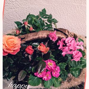 おはようございます☀ 久しぶりにお花のお買い物 色違いのフォーエバーのバラ2株ととシクラメン プリムラ とりあえずバスケットにそのまま詰め込みました