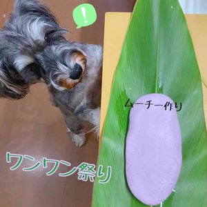 🏷ワンワン祭り(バトンハウスさん) 昨日のムーチーの日 コレは紅芋の粉末を餅粉と混ぜ捏ね 月桃の葉に包む準備をしている所 いつも何か食べたい🐶