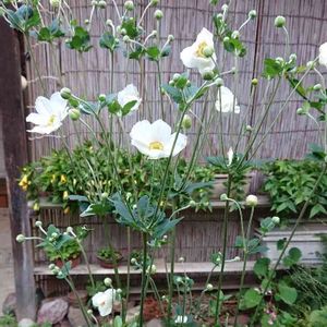 10/21 玄関先の庭 シュウメイギクの花びらがたくさん庭の苔の上に散り ちょっとしたアートに(*^^*)🌿 花後の丸刈り頭の様になった くりくり坊主😅