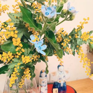 ミモザとブルースター 桃の花を買うつもりが😅 今年は小さなお雛様だけ…大きなお雛様出さずじまい(娘よごめんね) 春のお花で勘弁してね☺️